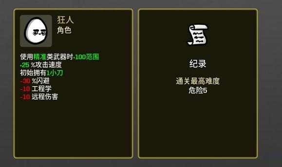 核心装备:狩猎奖杯。需要拿狂人赢过一次任意难度解锁。拿到直接恰 优先暴击伤害,近战伤害。生命值,护甲,生命窃取。幸运前期点一点,10回合前拿到狩猎奖杯无脑过。一回合700+材料 武器六精准,优先盗贼之刃偷钱。闪避无所谓。狂人钱非常多。有狩猎基本是其他职业两倍钱。拿道具堆属性