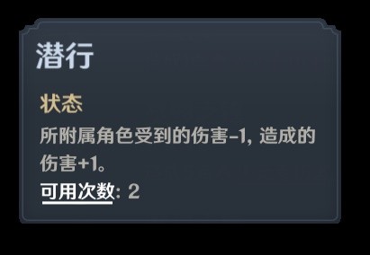 火之债务处理人在战斗开始时, 触发被动技“潜行大师”, 使其附属角色状态潜行。 该状态下, 角色受到的伤害值 -1, 造成的伤害值 +1。 初始可用次数为 2, 上限为 2。