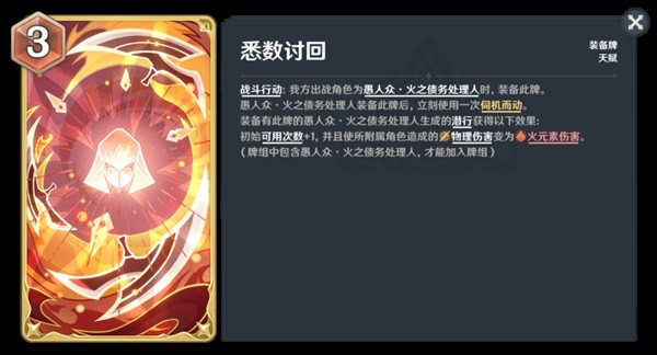 火之债务处理人的天赋“悉数讨回”为元素战技天赋。 装备天赋的火之债务处理人生成的角色状态潜行将。 <1> 获得 1 次额外可用次数及可用次数上限; <2> 使得该角色状态潜行附属的角色造成的物理伤害转化为火元素伤害。