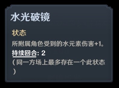 藏镜仕女的元素战技“潋波绽破”将为目标角色附属角色状态水光破镜, 使得其附属角色受到的水元素伤害值 +1, 初始持续回合为 2, 上限为 2。 同一方角色中, 至多存在 1 个附属该状态的角色。