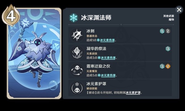 冰深渊法师的标准生命值为 4 点, 只能造成冰元素伤害, 元素爆发充能需求为 2 点, 爆发伤害为 5 点。