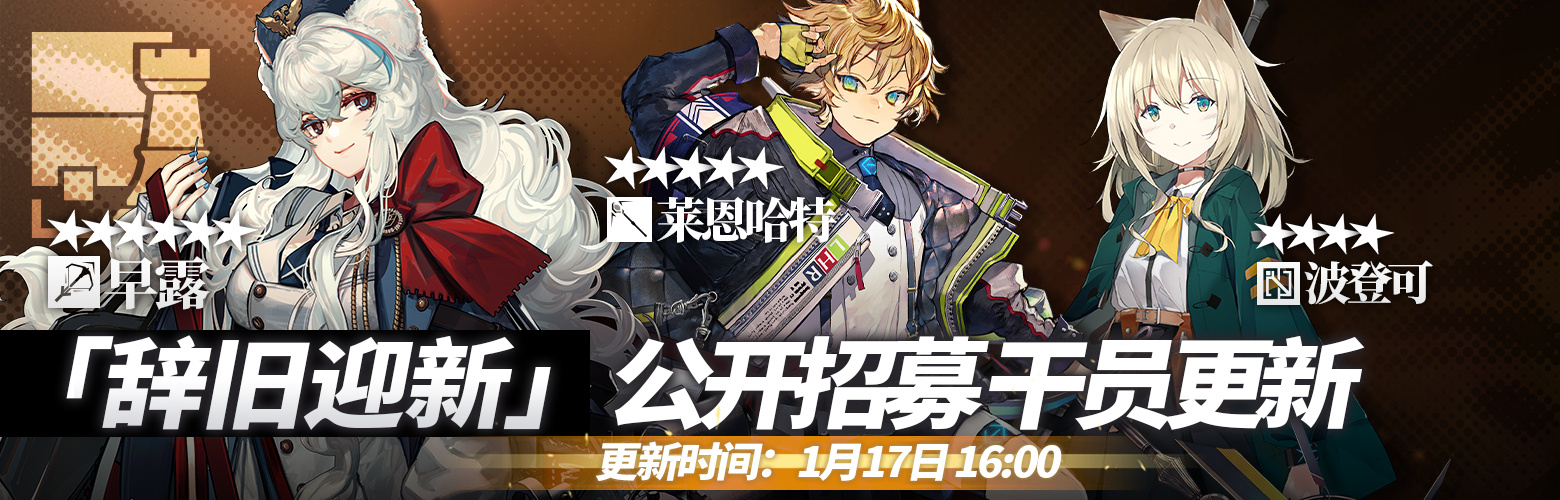 公开招募新增干员包括:六星狙击早露、五星术士莱恩哈特、四星辅助波登可
