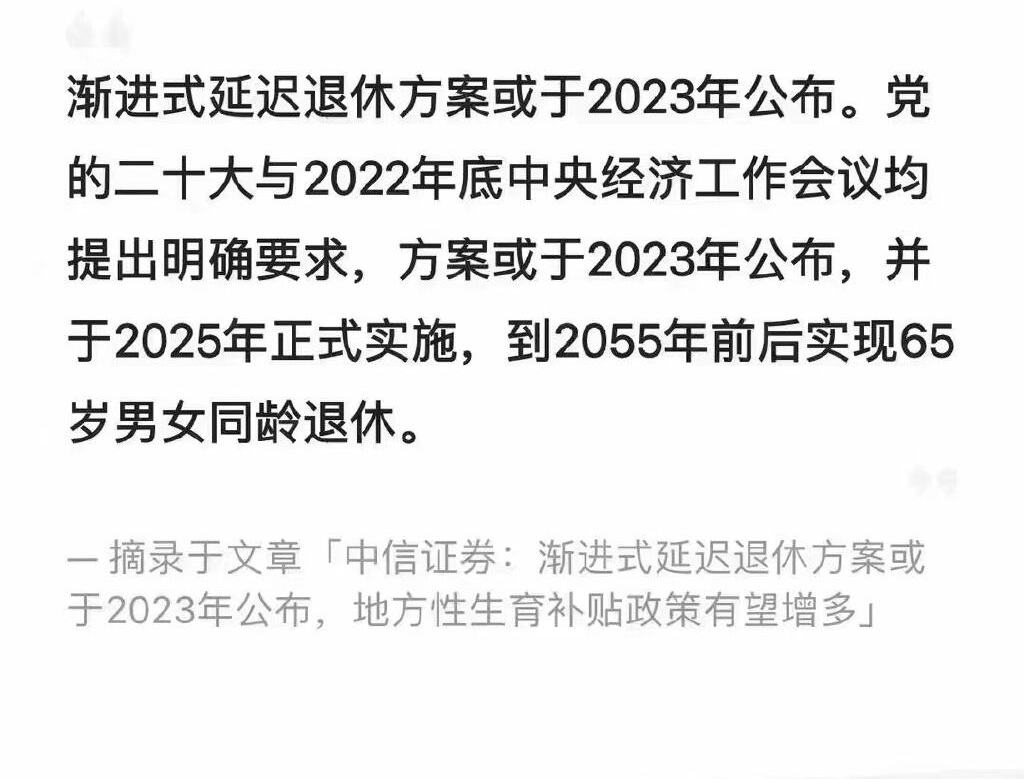 近期延迟退休年龄方案正式公布: 1. 女职工退休年龄=50+3×(50+出生年份-年份)/12。 2. 女干部退休年龄=55+3×(55+出生年份-年份)/12。 3. 男性退休年龄=60+3×(60+出生年份-年份)/12。 (上述公式仅供参考,后续可能会更新新的计算公式) 渐进式延迟退休方案或于2023年公布。党的二十大与2022年底中央经济工作会议均提出明确要求,方案或于2023年公布,并于2025年正式实施,到2055年前后实现65岁男女同龄退休。