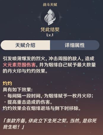 引发喷薄爆发的烈火,冲击周围的敌人,造成火元素范围伤害,并为烟绯自己赋予最大数量的丹火印与灼灼效果。灼灼具有如下效果,每间隔一段时间,为烟绯赋予一枚丹火印。提高重击造成的伤害。灼灼效果会在烟绯退场与倒下时移除。