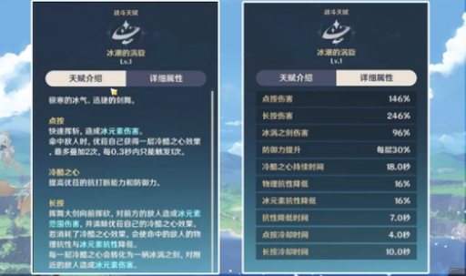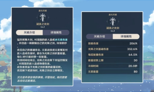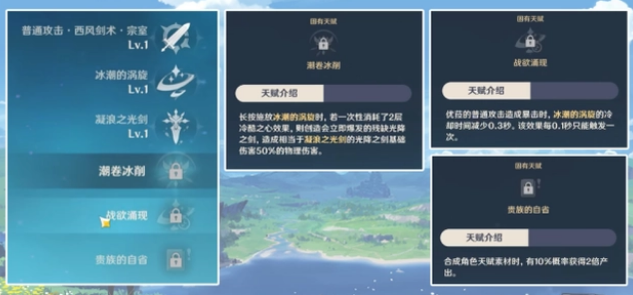 第一个叫做潮卷冰削,长按E技能的时候如果消耗了2层冰酷之心,就会召唤一个残缺的光降之剑,造成基础伤害50%的物理伤害,1级天赋就是176.3%,倍率也算挺高了。第二个叫做战欲涌现,普攻造成暴击时,可以降低E技能0.3秒冷却时间,也是神技,只要暴击率叠上来,E技能很快就能再用,普攻一套五段伤害可以减少1.5秒冷却时间。第三个天赋是合成角色素材时,有10%几率两倍产出。