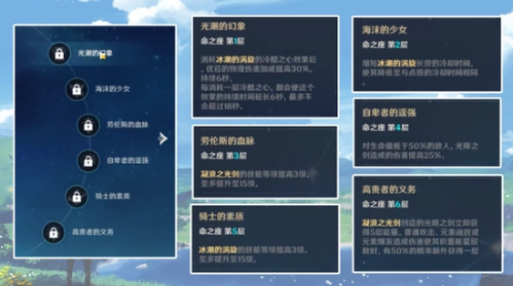 优菈的命之座,抛开3命和5命不谈,这两个命座都是固定加技能等级,其他每个命座都非常关键,几乎都是质变技能!1命可以让优菈长按E消除冷酷之心时,获得30%物伤加成,持续6秒,每个冷酷之心还能额外加6秒,基本就是常驻30%物伤加成了。2命让E技能长按和短按的CD变成一样,等于长按直接从10秒缩短到4秒,太强了吧!4命,对于生命值低于50%的敌人,光降之剑的伤害提升25%,比例也挺高。6命,光降之剑初始就有5层能量,之后每次普攻和技能还有50%额外再获得1层,叠满30层不是梦!