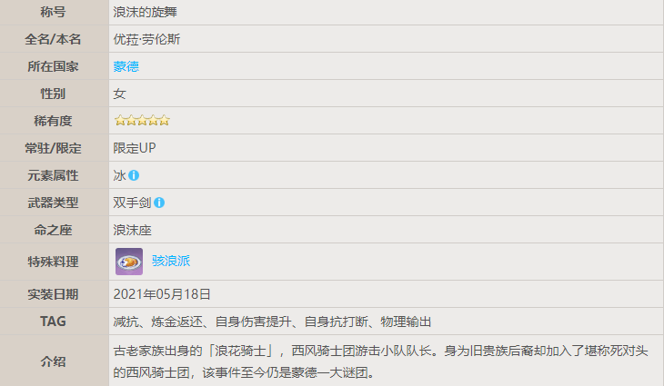 有「浪花骑士」之称的优菈不仅剑术精湛,更兼备谋略与胆识。大团长法尔伽曾给予她极高的评价,称她为可与「蒲公英骑士」比肩的优秀战士。