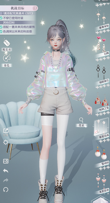 未来风格的服饰是玩呐6-5关卡的关卡要求 1、炫酷动感的时尚街拍 2、不穿已使用时装并且是一套通关 3、未来风格 这里用3/4星的服装也能过,如果需要染色就用灰色盘第一个颜色 参考搭配见下图