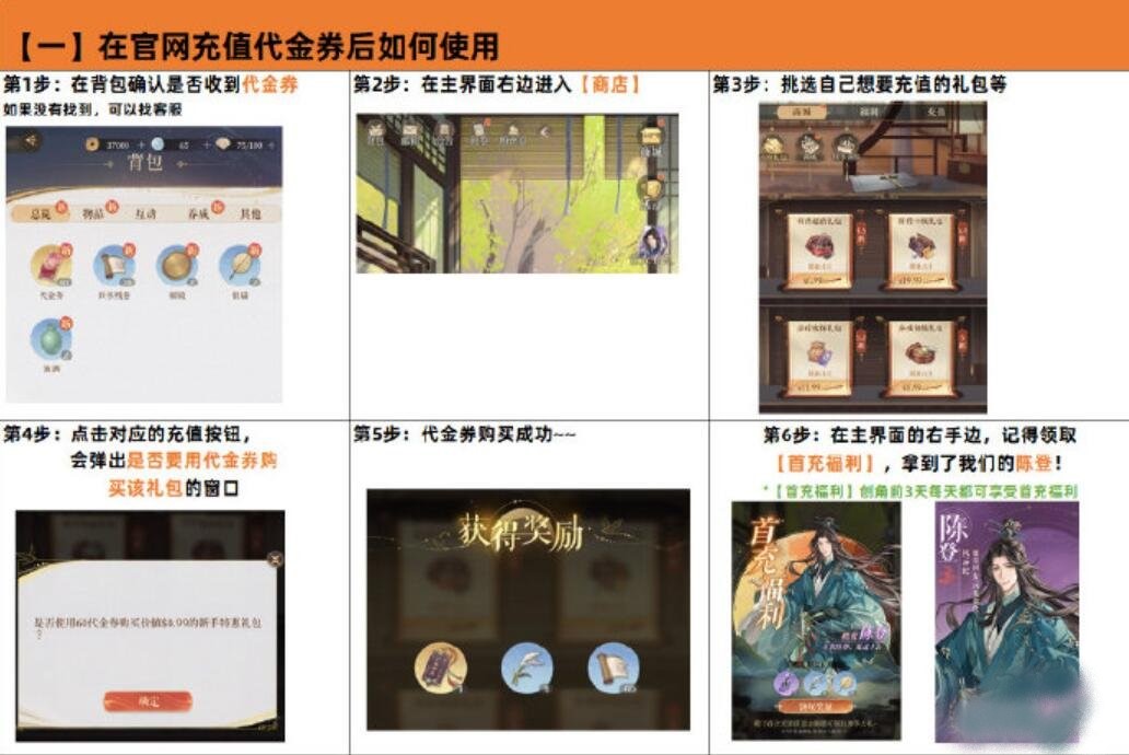 代金券使用方法 第1步: 在背包确认是否收到代金券如果没有找到,可以找客服 第2步: 在主界面右边进入【商店】 第3步: 挑选自己想要充值的礼包等 第4步: 点击对应的充值按钮,会弹出是否要用代金券购买该礼包的窗口 第5步: 代金券购买成功~ 第6步: 在主界面的右手边,记得领取 【首充福利】,拿到了我们的陈登! 【首充福利】创角前3天每天都可享受首充福利
