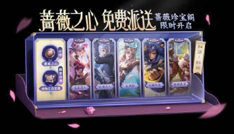 蔷薇珍宝阁限时开启 活动时间: 4月28日-5月10日 活动入口: 游戏内大厅-朋友节-【蔷薇珍宝】兑稀有皮肤