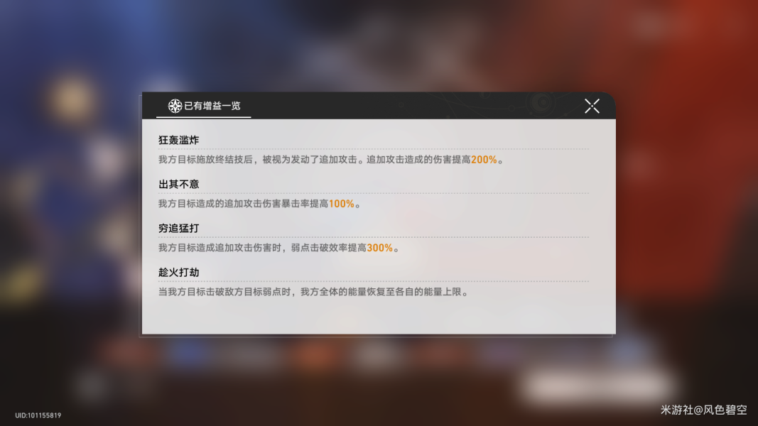 第一档和第二档的奖励能够轻松获取,不再赘述,主要描述下通过配队达到的8轮完成挑战。 初始具有一个增益,每通关一关会获得一个增益效果,所有的增益效果如下图所示。