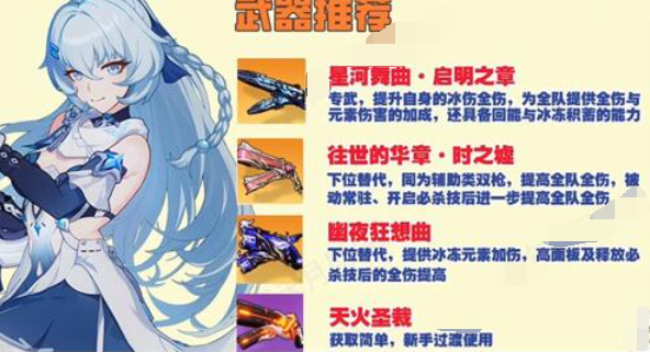 1、武器首选 专武[星河舞曲·启明之章] 可以增加冰伤、全伤,冰易伤三种属性,要是没有的话那么就可以用伊甸专武[往世的华章:时之墟],冰卡专武[幽夜狂想曲],或其他高面板武器(如终焉专武和炎律专武);