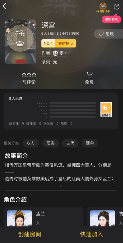 答案:淑妃/德妃 剧本信息 剧本名:《深宫》 剧本人数:6人 剧本题材:古代、现实 剧本难度:简单 作者:麦 人物简介 孟兰:端庄贤明皇后。夜深忽梦少年事,梦啼妆泪红阑干。 古心:英姿飒爽贵妃。人生自古谁无死,留取丹心照汗青。 梅朗:沉默柔弱德妃。郎骑竹马来,绕床弄青梅。 白璃:清冷孤傲淑妃。愿得一人心,白首不相离。 张昔:温润如玉太医。衣沾不足惜,但使愿无违。 孟剑:光明磊落侍卫。醉里挑灯看剑,梦回吹角连营。