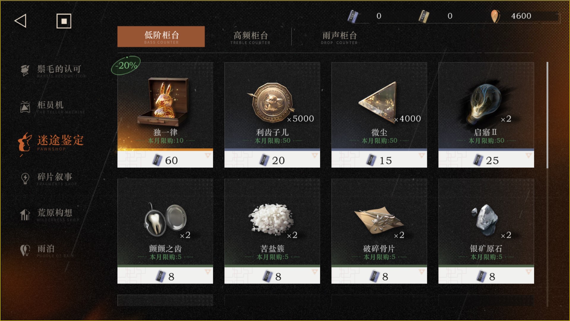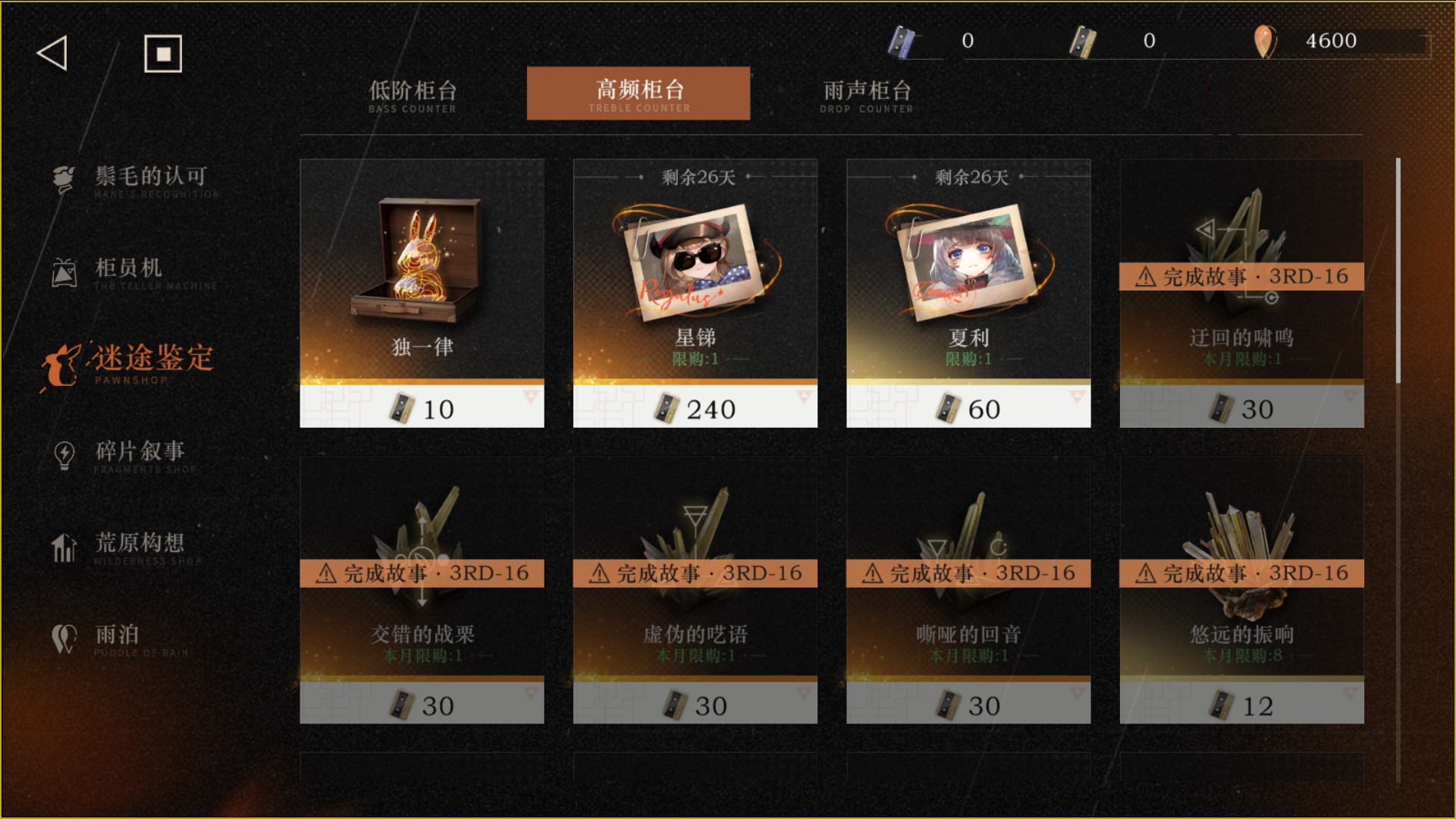 低阶柜台消耗的材料来源于抽卡和周常任务,这个商店除了独一律就全是材料了。平民玩家建议只换独一律。 迷途鉴定——高频柜台