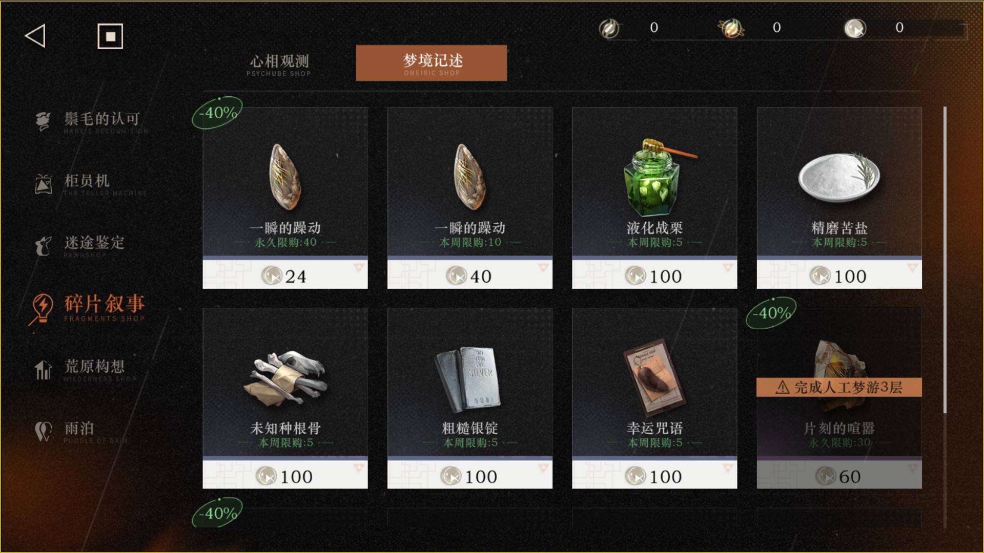 心相变为免费装备后,就主要靠这个商店兑换了,所需材料来源于四大资源本中的意志解析,如果大家有需要,后续棉被会出一个兑换优先级顺序,方便大家参考。 碎片叙事——梦境记述