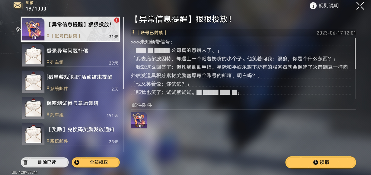 今天(6.17)中午12点 银狼黑掉了崩坏星穹铁道的官方账号并附言送了东西让玩家上线查看,连官博都变成银狼的头像